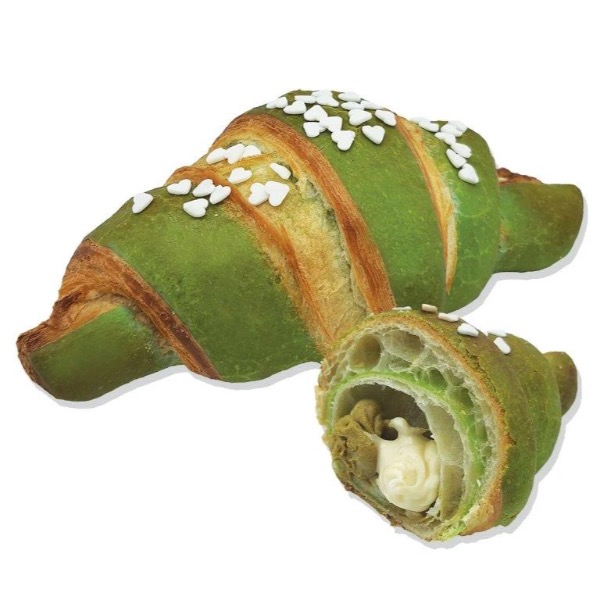 Delizioso cornetto ripieno di cioccolato bianco e farcitura al pistacchio, decorato con cuoricini di zucchero.