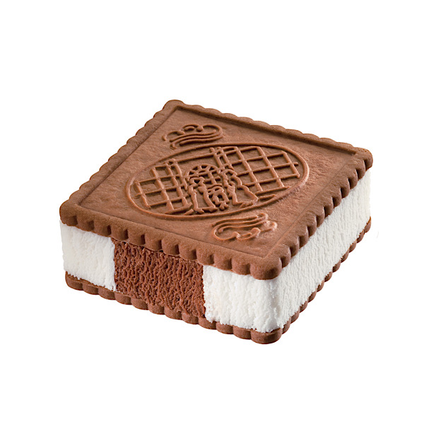 Due cialde di biscotto al cacao, custodiscono una miscela di cremoso gelato alla panna e al cacao.