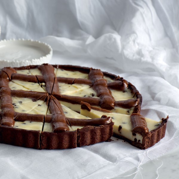 Tarte con frolla al cioccolato e farcitura cremosa di ricotta:e gocce di cioccolato un equilibrio goloso tra intensità e delicatezza.